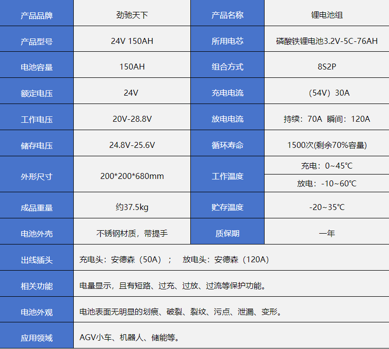储存电压24.8V-25.6V循环寿命1500次(剩余70%容量)
